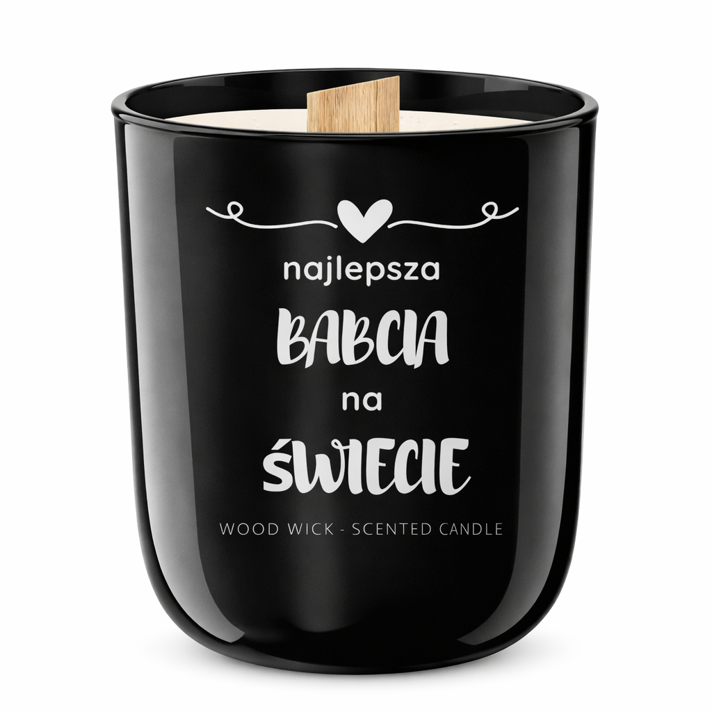 Świeca sojowa o zapachu perfum z naturalnym, drewnianym knotem, umieszczona w eleganckim, czarnym szklanym naczyniu . Drewniany knot zapewnia równomierne i stabilne spalanie, nie powodując efektu trzaskania ani dźwięku palącego się drewna. Minimalistyczny, biały nadruk na froncie świecy tworzy wyraźny kontrast z głęboką czernią szkła, podkreślając nowoczesny i elegancki charakter produktu. Świeca doskonale sprawdzi się jako stylowy element wystroju wnętrza, a także jako wyjątkowy i ponadczasowy prezent na Dzień Babci i Dziadka oraz inne szczególne okazje.