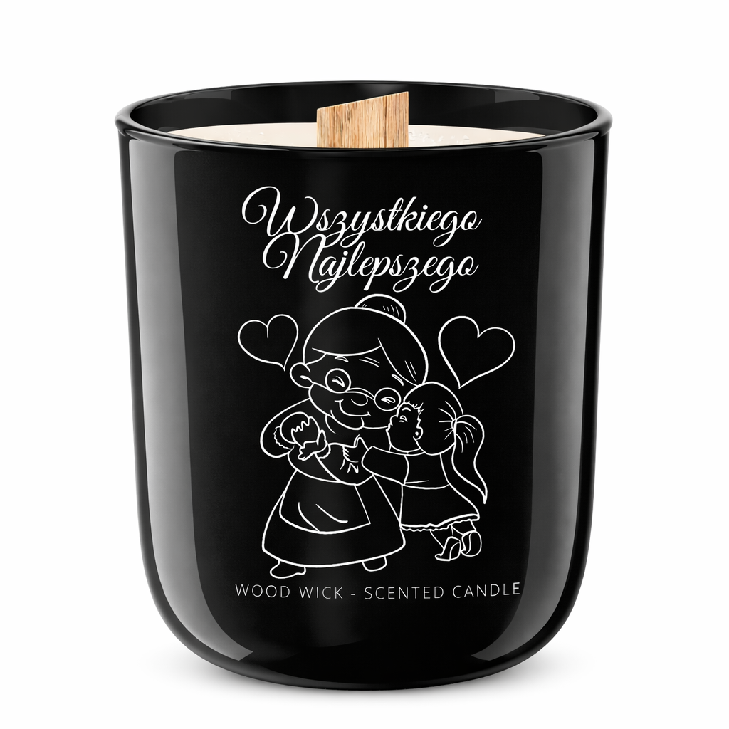 Świeca sojowa o zapachu perfum z naturalnym, drewnianym knotem, umieszczona w eleganckim, czarnym szklanym naczyniu . Drewniany knot zapewnia równomierne i stabilne spalanie, nie powodując efektu trzaskania ani dźwięku palącego się drewna. Minimalistyczny, biały nadruk na froncie świecy tworzy wyraźny kontrast z głęboką czernią szkła, podkreślając nowoczesny i elegancki charakter produktu. Świeca doskonale sprawdzi się jako stylowy element wystroju wnętrza, a także jako wyjątkowy i ponadczasowy prezent na Dzień Babci i Dziadka oraz inne szczególne okazje.