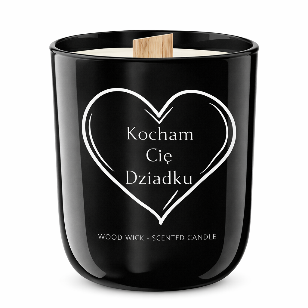 Świeca sojowa o zapachu perfum z naturalnym, drewnianym knotem, umieszczona w eleganckim, czarnym szklanym naczyniu . Drewniany knot zapewnia równomierne i stabilne spalanie, nie powodując efektu trzaskania ani dźwięku palącego się drewna. Minimalistyczny, biały nadruk na froncie świecy tworzy wyraźny kontrast z głęboką czernią szkła, podkreślając nowoczesny i elegancki charakter produktu. Świeca doskonale sprawdzi się jako stylowy element wystroju wnętrza, a także jako wyjątkowy i ponadczasowy prezent na Dzień Babci i Dziadka oraz inne szczególne okazje.