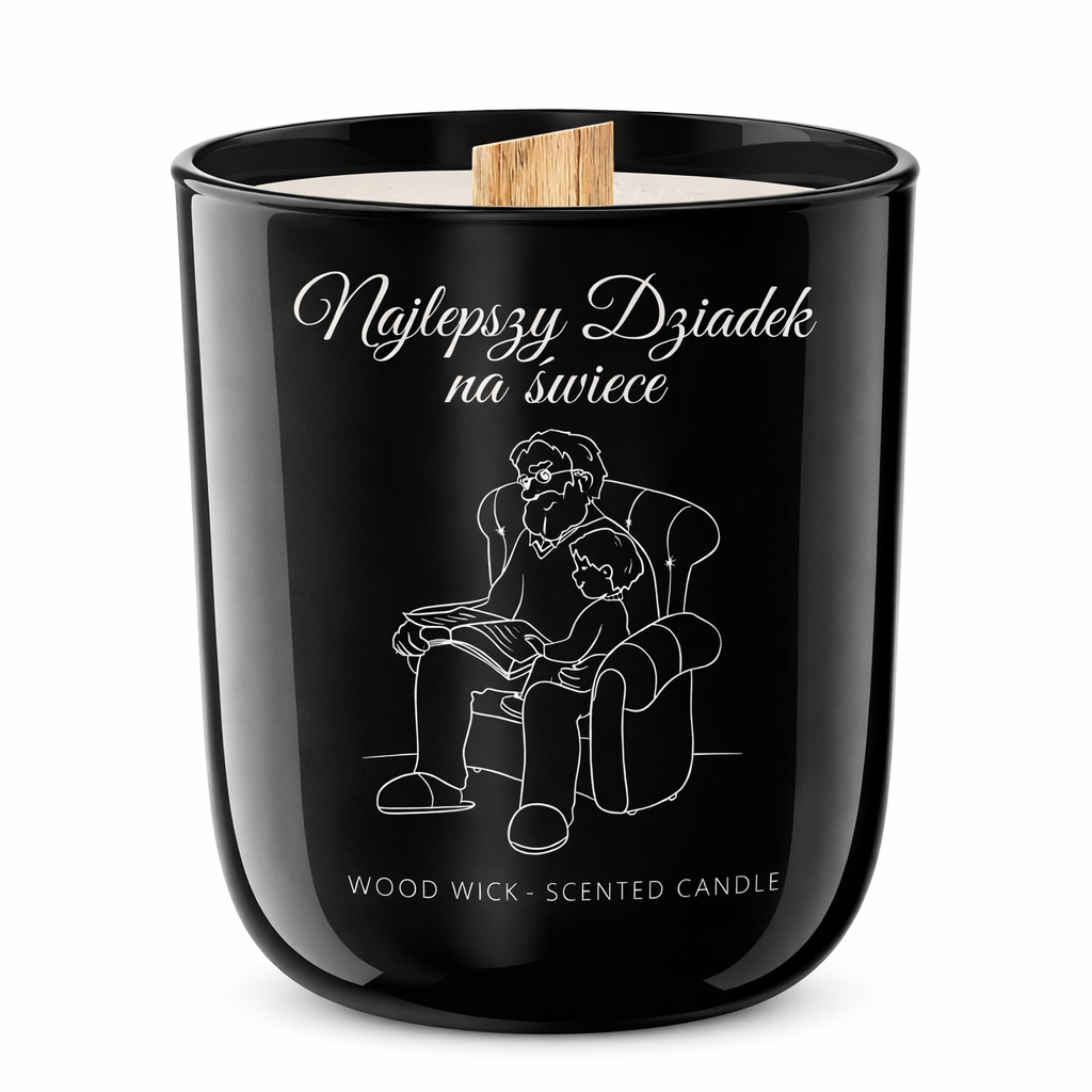 Świeca sojowa o zapachu perfum z naturalnym, drewnianym knotem, umieszczona w eleganckim, czarnym szklanym naczyniu . Drewniany knot zapewnia równomierne i stabilne spalanie, nie powodując efektu trzaskania ani dźwięku palącego się drewna. Minimalistyczny, biały nadruk na froncie świecy tworzy wyraźny kontrast z głęboką czernią szkła, podkreślając nowoczesny i elegancki charakter produktu. Świeca doskonale sprawdzi się jako stylowy element wystroju wnętrza, a także jako wyjątkowy i ponadczasowy prezent na Dzień Babci i Dziadka oraz inne szczególne okazje.